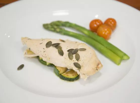 Modo de preparação: Cozer os espargos em água com sal e azeite. Saltear as courgettes em azeite, temperar os peitos de frango com azeite, sal, pimenta e levar ao forno 25 minutos a 180 graus com o tomilho. De seguida, moer as sementes de abóbora e colocar por cima do peito de frango.