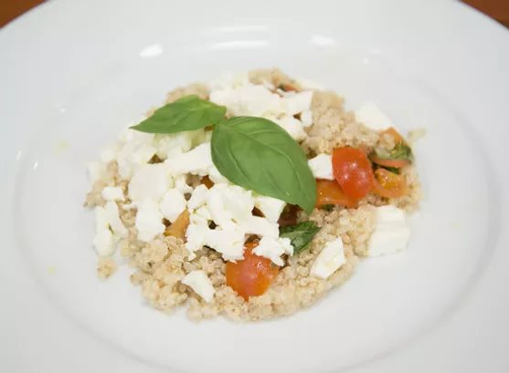 Modo de preparação: Cozer a quinoa em chá verde durante 12 minutos, cortar os tomates em 4 pedaços, juntar tudo e temperar com azeite e sumo de limão. De seguida colocar queijo fresco por cima e manjericão picado.